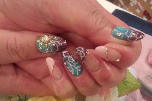 ターコイズブルーに京紫のグラデーションにホワイトのフラワーアートが個性的♪