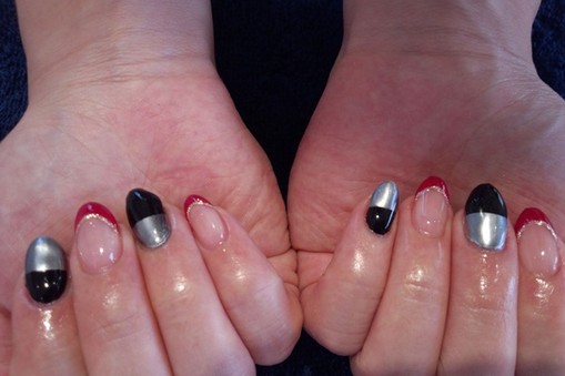 ブラック×メタルグレーのバイカラーでカッコよく、真っ赤なフレンチを組み合わせてちょっぴりセクシーに。 濃い目のお色は秋~冬に合いそうです。